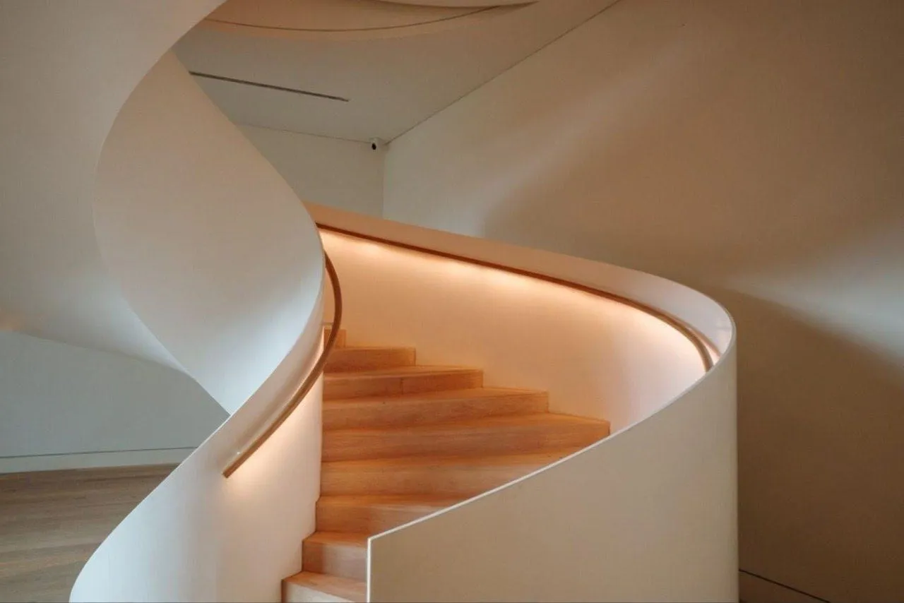Идея для вашей лестницы: Чтобы усилить эффект «парящих» ступеней, используйте направленное трековое освещение. Пучки света, направленные на стену под ступенями, создадут игру света и тени, визуально сделав конструкцию еще более легкой и графичной.